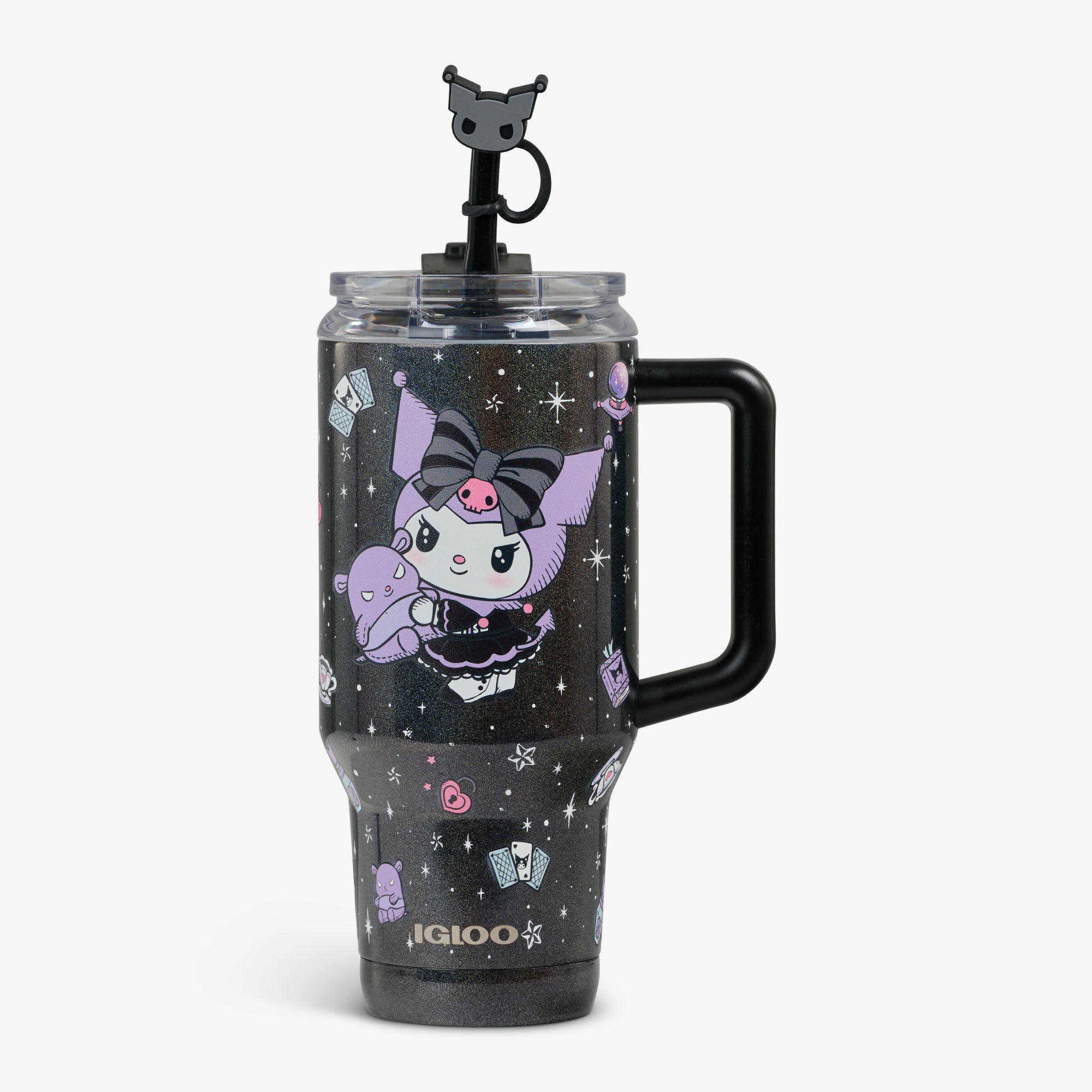 Kuromify how you hydrate with this large Sanrio® stainless steel mug tumbler inspired by the mischievous and charming Kuromi™. Glittery black and purple with a supercute straw topper. a hint of magic and a glimpse of Baku™. our special-edition Kuromi drinkware is as unique as she is.